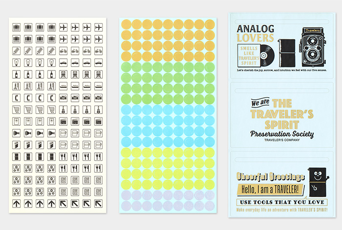 這套貼紙套裝可用於定制您的旅行者筆記本,使其更加有趣,包含索引貼紙、口袋貼紙、代表不同計劃的圖標貼紙、幹轉印貼紙以及用於裝飾封面的貼紙。 2026年版的設計靈感源自於「旅行者精神」。