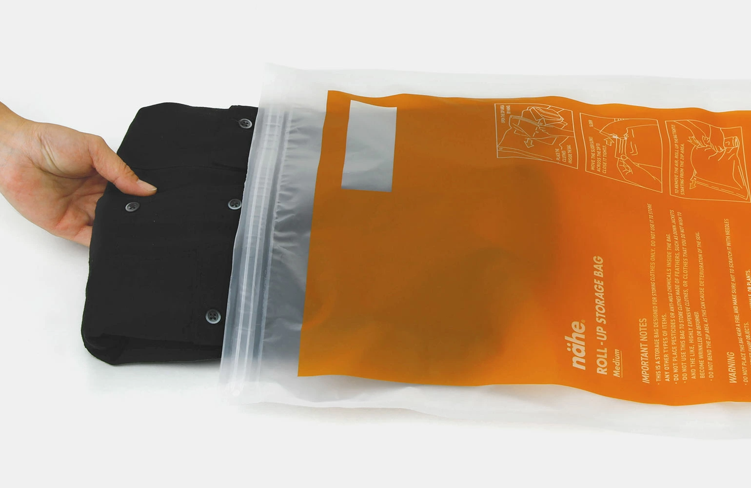 使用方法很簡單:只需將衣服放入,拉上拉鍊,然後將其折疊起來擠出空氣即可。